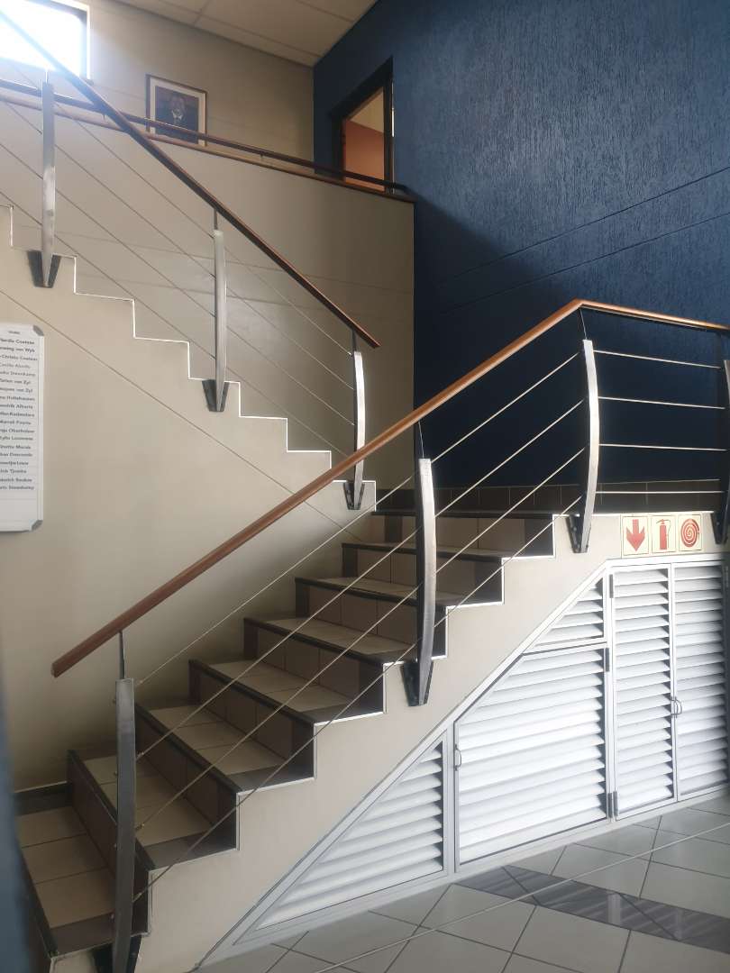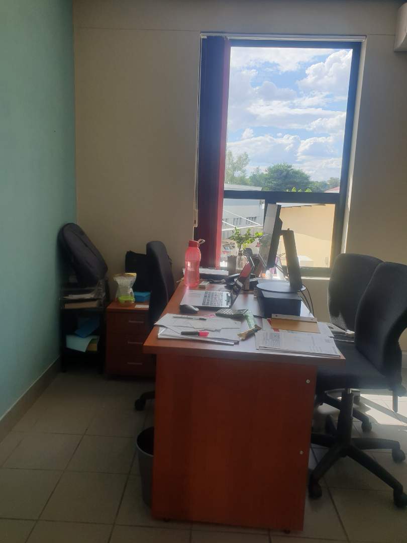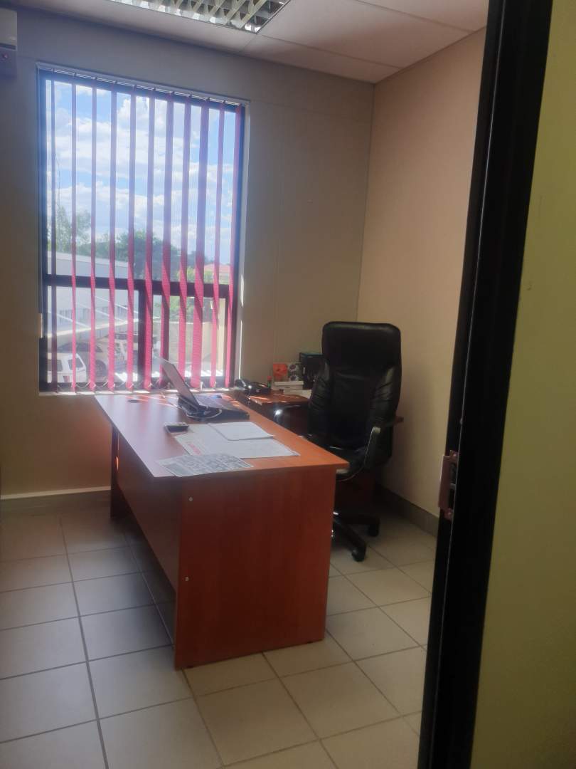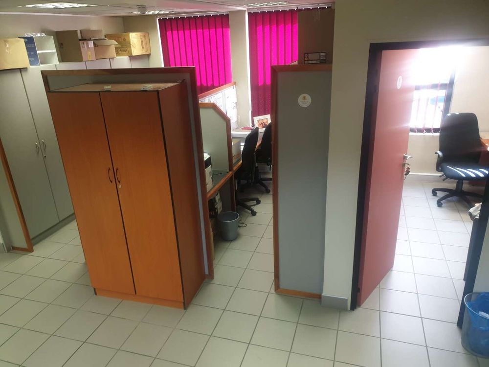 The double-storey building has plastered- and painted brick walls, filled in with aluminium window- and doors frames, under an iron roof and with suspended ceilings. The floors of the offices are tiled. The building is equipped with air-conditioners. The necessary security measures are in place and solar power panels have been installed. The building includes the following: