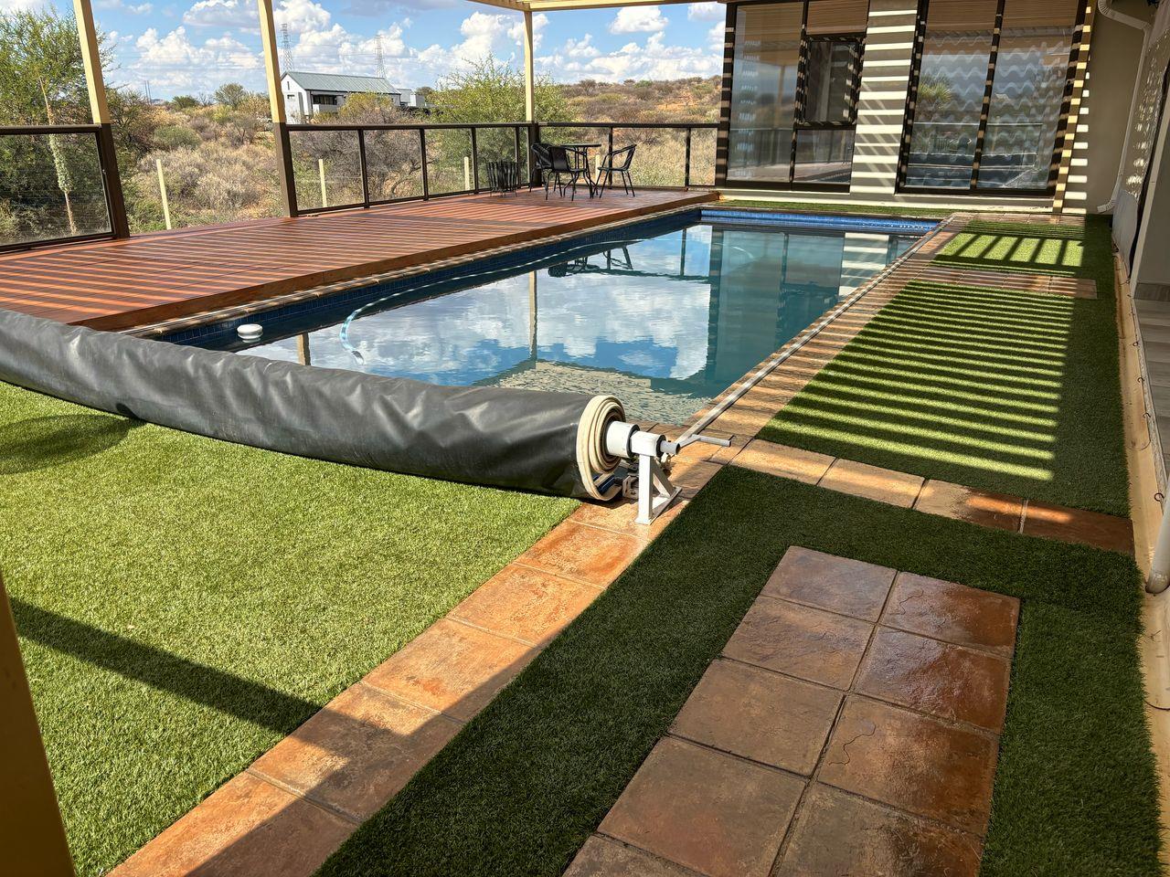 The main house has 3 bedrooms, 3 bathrooms , study and opens up to a swimming pool entertainment area .